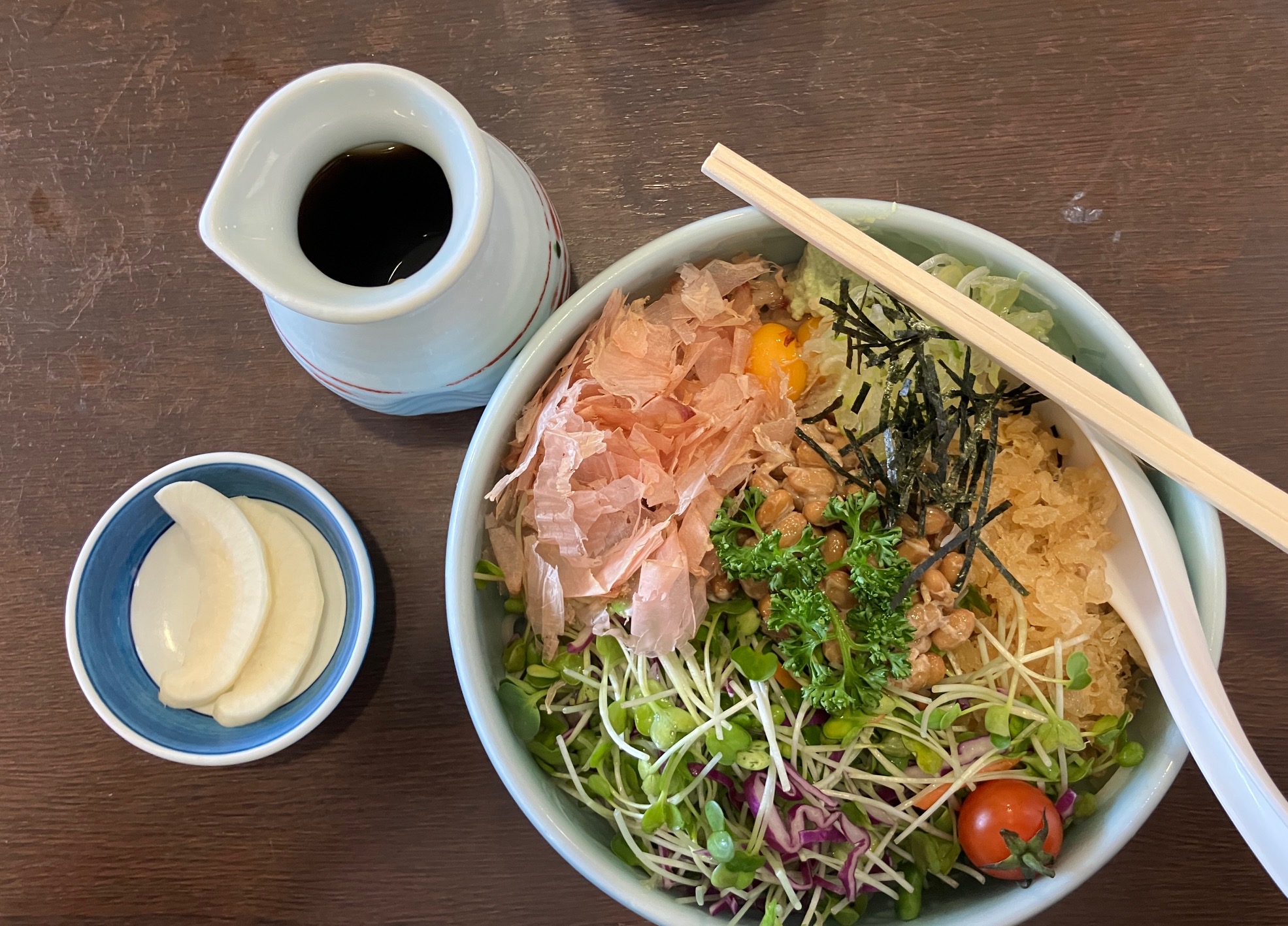 多くのお客さまが注文する不動の人気メニューです。特徴として納豆だけでなく、たっぷりのカイワレ大根、天かす、かつお節、海苔、ネギ、そしてアクセントのトマトやうずらの卵などが、蕎麦が見えないほどぎっしりと載っています。具材をこれでもかというほど混ぜてから食べるのが良くて、粘りのある納豆と、サクサクの天かす、シャキシャキのカイワレが合わさり、独特の食感が楽しめます。値段は1,250円と蕎麦としては少し高めですが、ボリュームと満足感で納得すると思います。麺は白っぽい更科系。コシがかなり強く、喉越しが良いタイプです。つゆは鰹の香りが効いた、少し濃いめのつゆが私は大好きです。一緒についてくる「がっこ」も美味しくて、濃厚な納豆蕎麦の合間につまむと口の中がリセットされる名脇役として喜ばれています。店内は広々としていて、奥行きがあり、お座敷もあります。席に着くとまず「蕎麦湯」が出されて、おや?と思うかもしれません・・